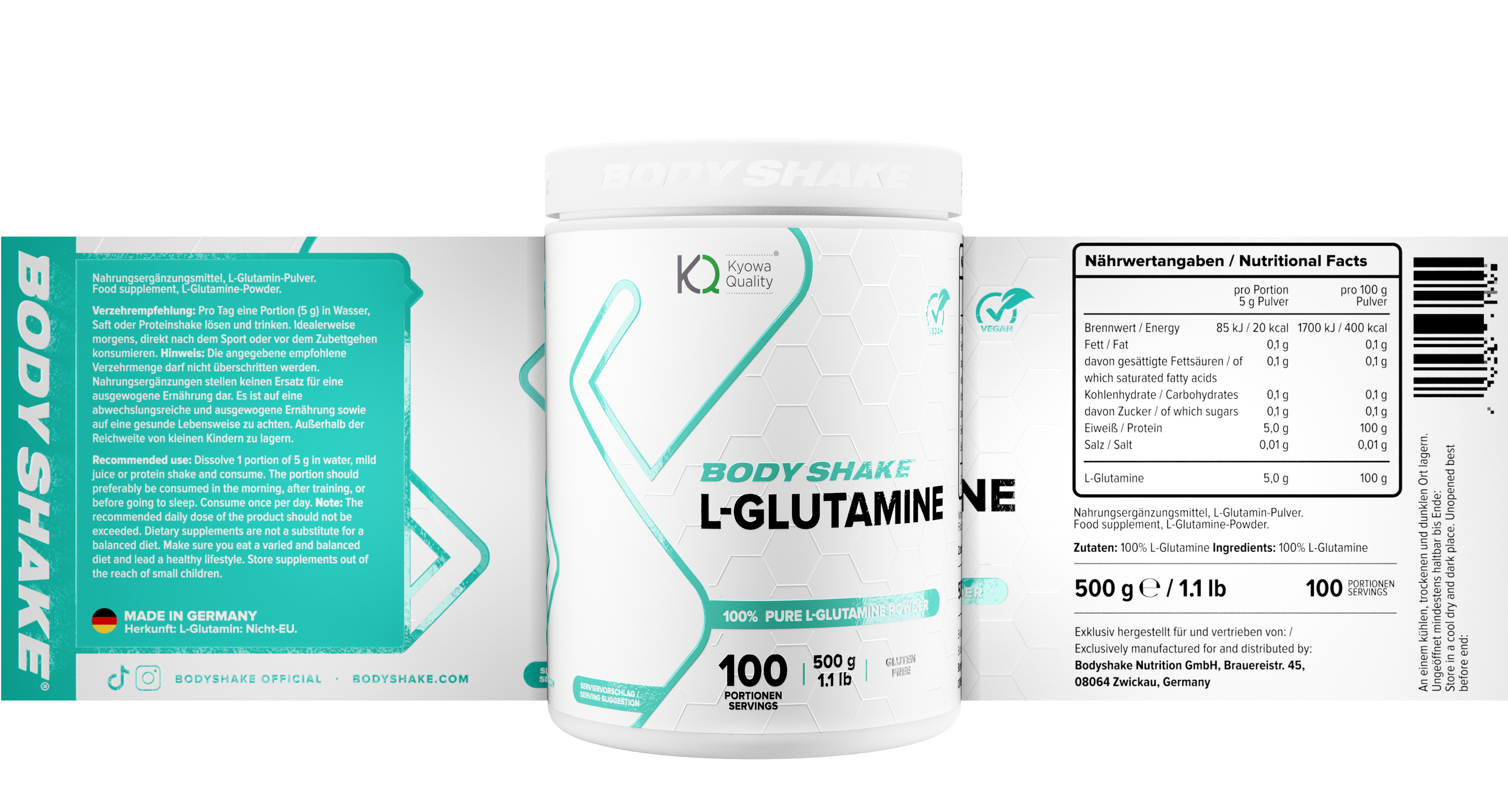 KYOWA® ist eine besonders reine Form von Glutamin, benannt nach dem seinem Hersteller, dem japanischen Pharmakonzern Kyowa Kirin. Das BODYSHAKE® KYOWA Glutamin ist frei von tierischen Inhaltsstoffen und sonstigen Zusätzen. Unter Sportlern gilt KYOWA® als der Goldstandard unter den Glutamin-Produkten und ist in Qualität, Performance und Reinheit unerreicht.